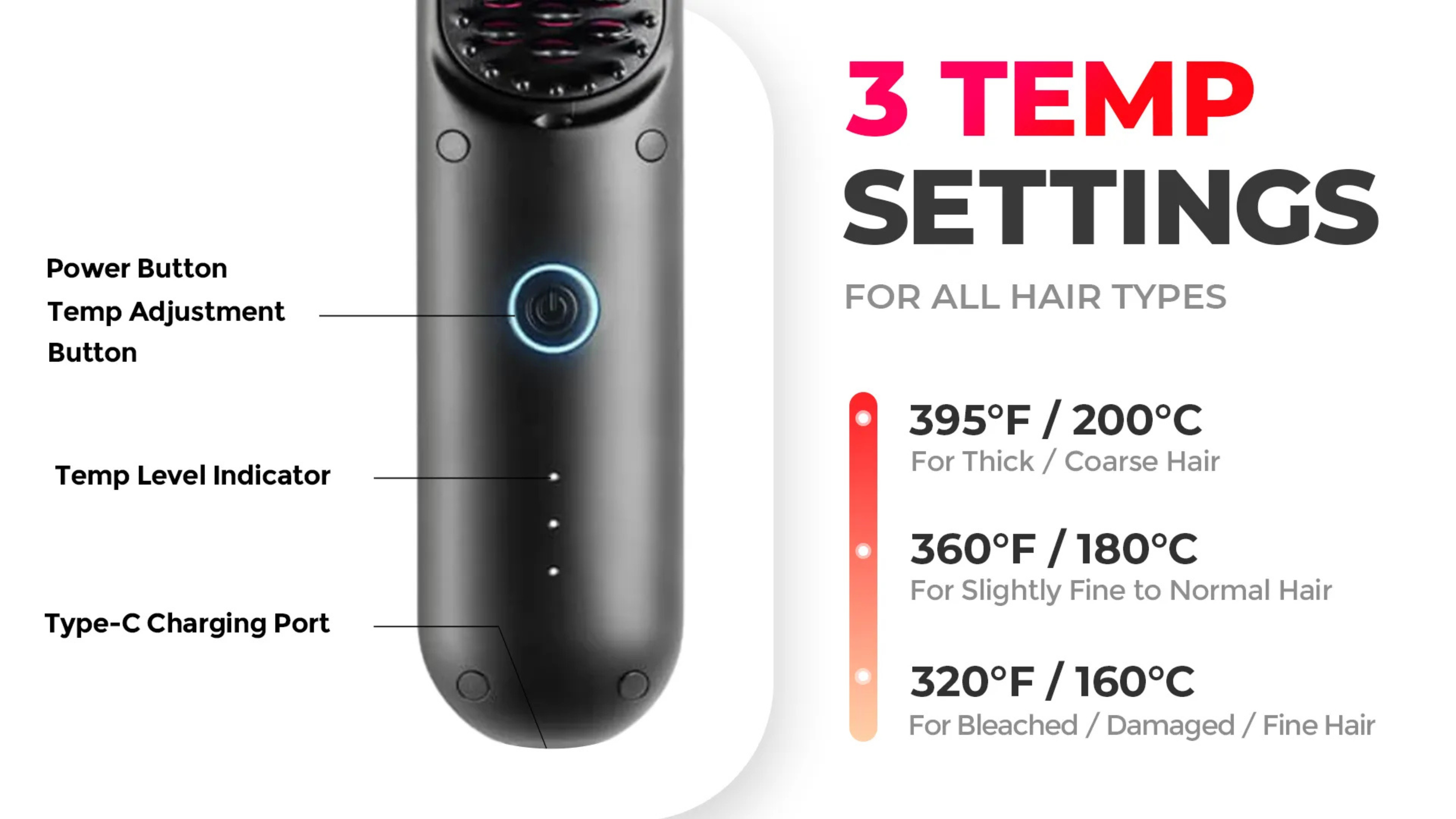 Even at the highest temperature setting, 40 minutes of battery life is plenty of time for a fast touch-up or style switch. Three heat settings are appropriate for 1 to 3C hair texture.