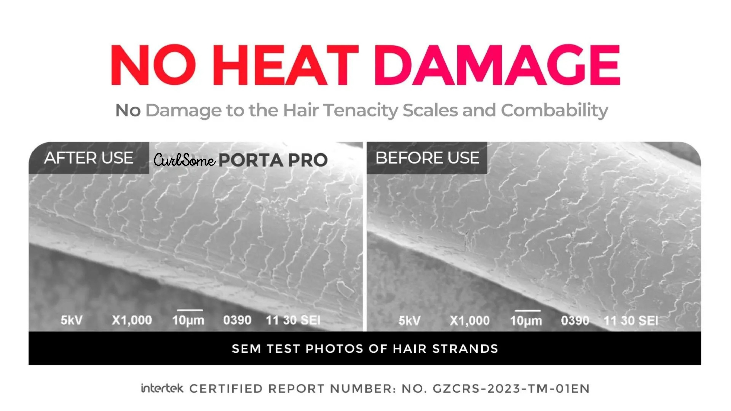 CURLSOME Porta Pro produces 200 million negative ions per cubic centimeter when used. When heated, the innovative ceramic heating tooth comb causes no thermal damage to the hair scales. The trial resulted in 0% hair damage. (*Intertek Laboratory)