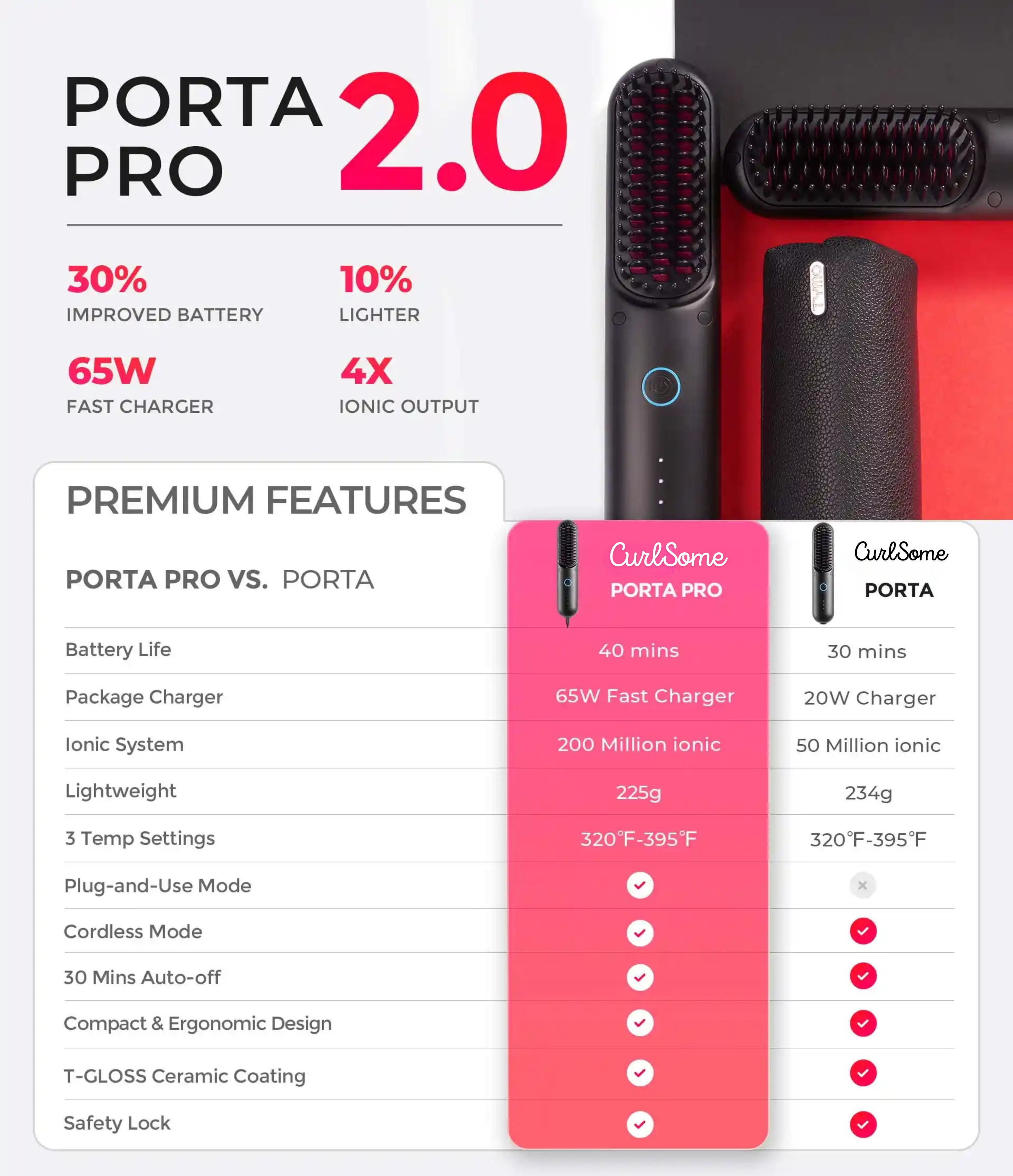 CURLSOME PORTA only offers a cordless mode. CURLSOME PORTA PRO has both cordless and corded modes, making it suitable for usage at home or on the move. Furthermore, CURLSOME PORTA PRO has improved the ionic 200 million technology to achieve anti-frizz outcomes.
