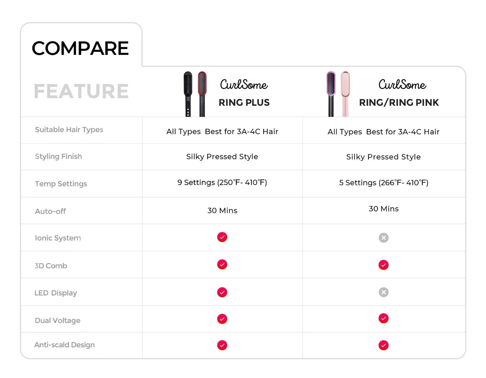 Our straightening brush is a game-changer for thick hair. Customers with extremely thick hair have reported straightening their hair in about five minutes as opposed to hours with CURLSOME RING PLUS. Even the thickest hair may be straightened effectively thanks to the high heat setting.